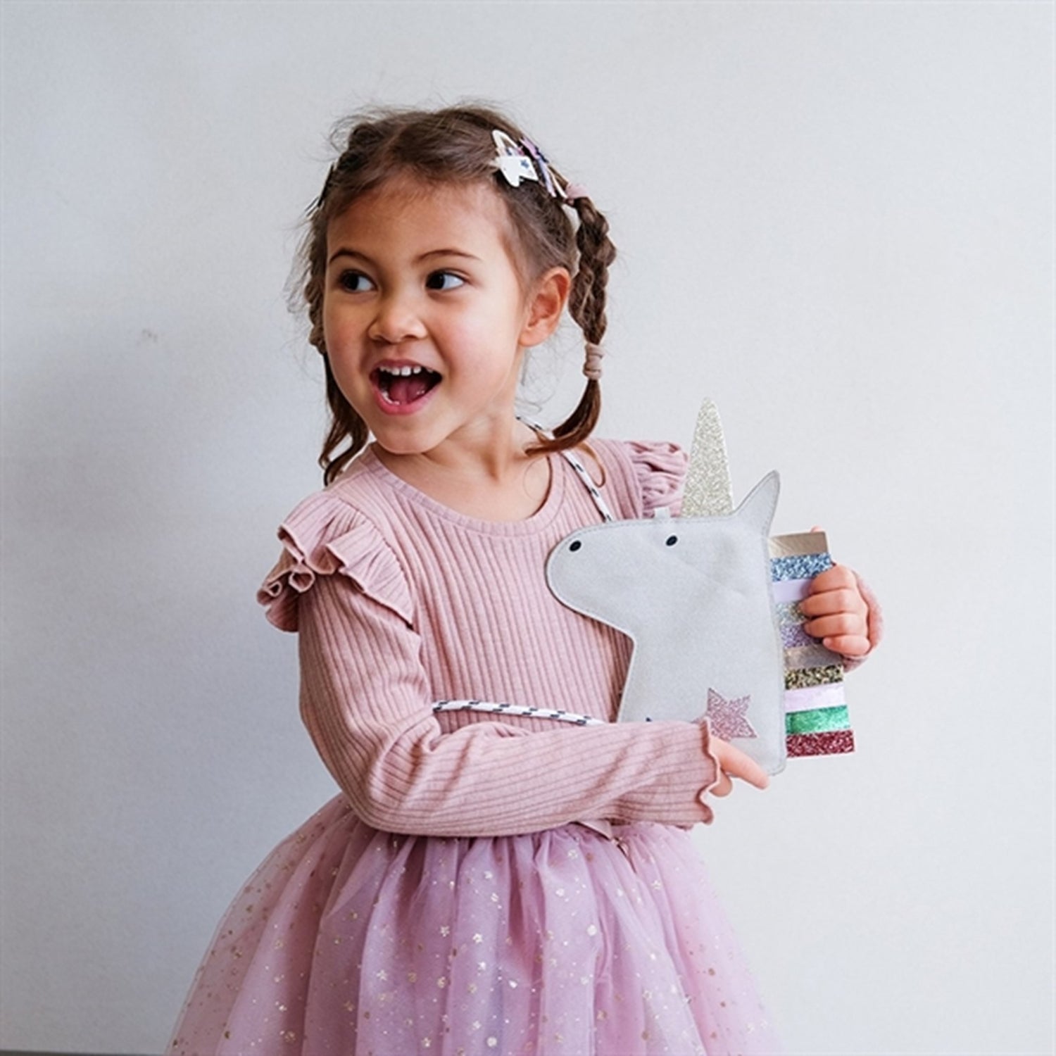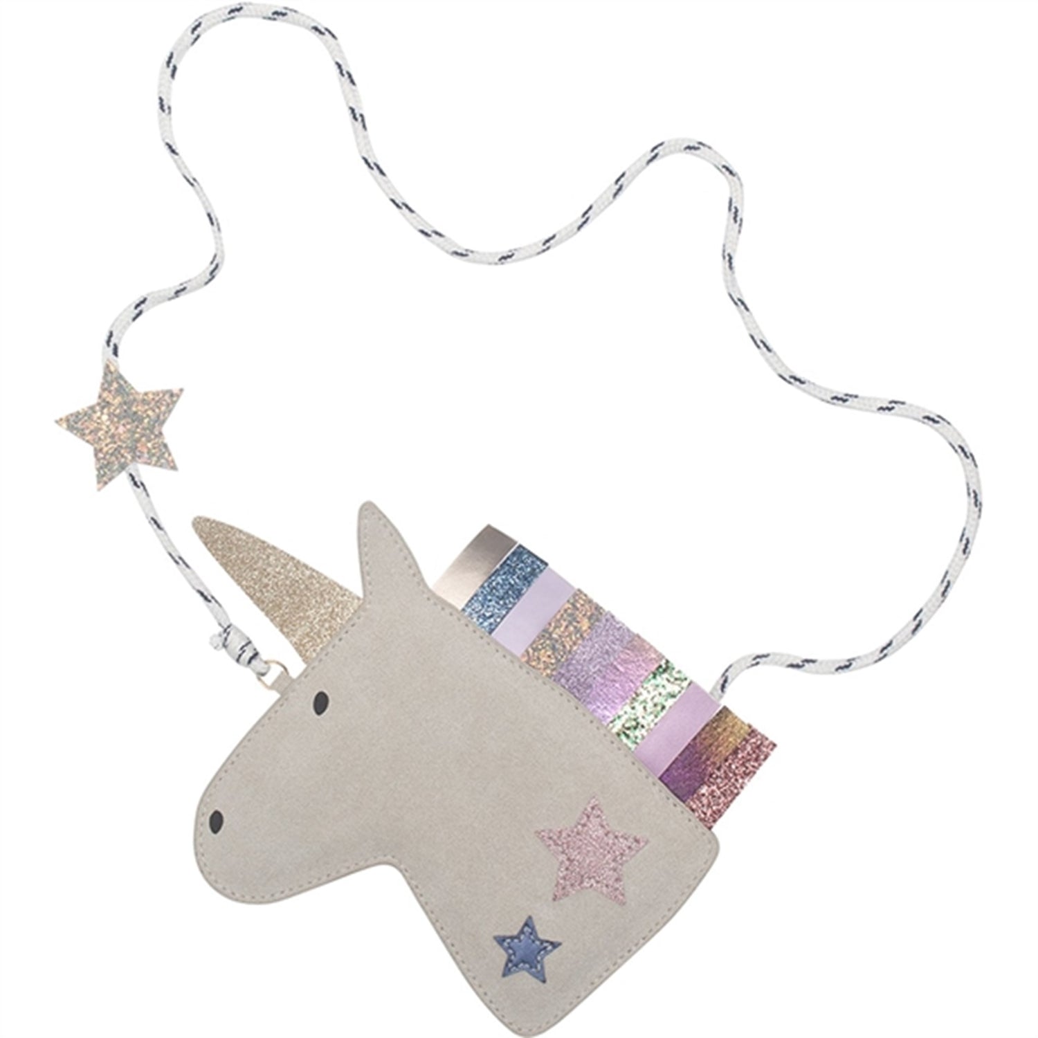 Bag with striped strap, shaped as a unicorn.The unicorn has a sparkling horn and mane plus an extra sparkling star decoration.
