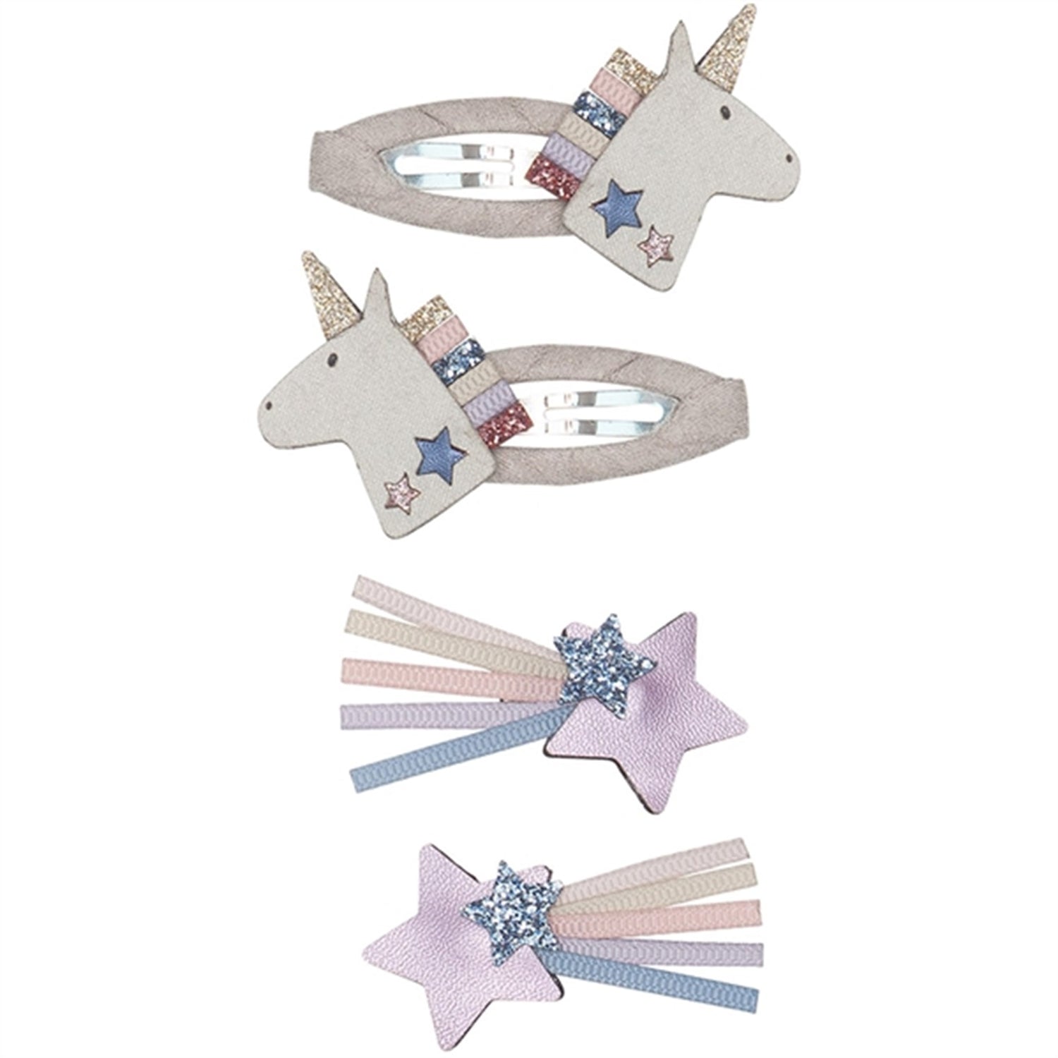 A space unicorn themed set of hair accessories with hair clips and clic clacs.1 pair of hair clips with shooting stars and satin tales.1 pair of clic clacs with glittery unicorns and satin ribbon.
