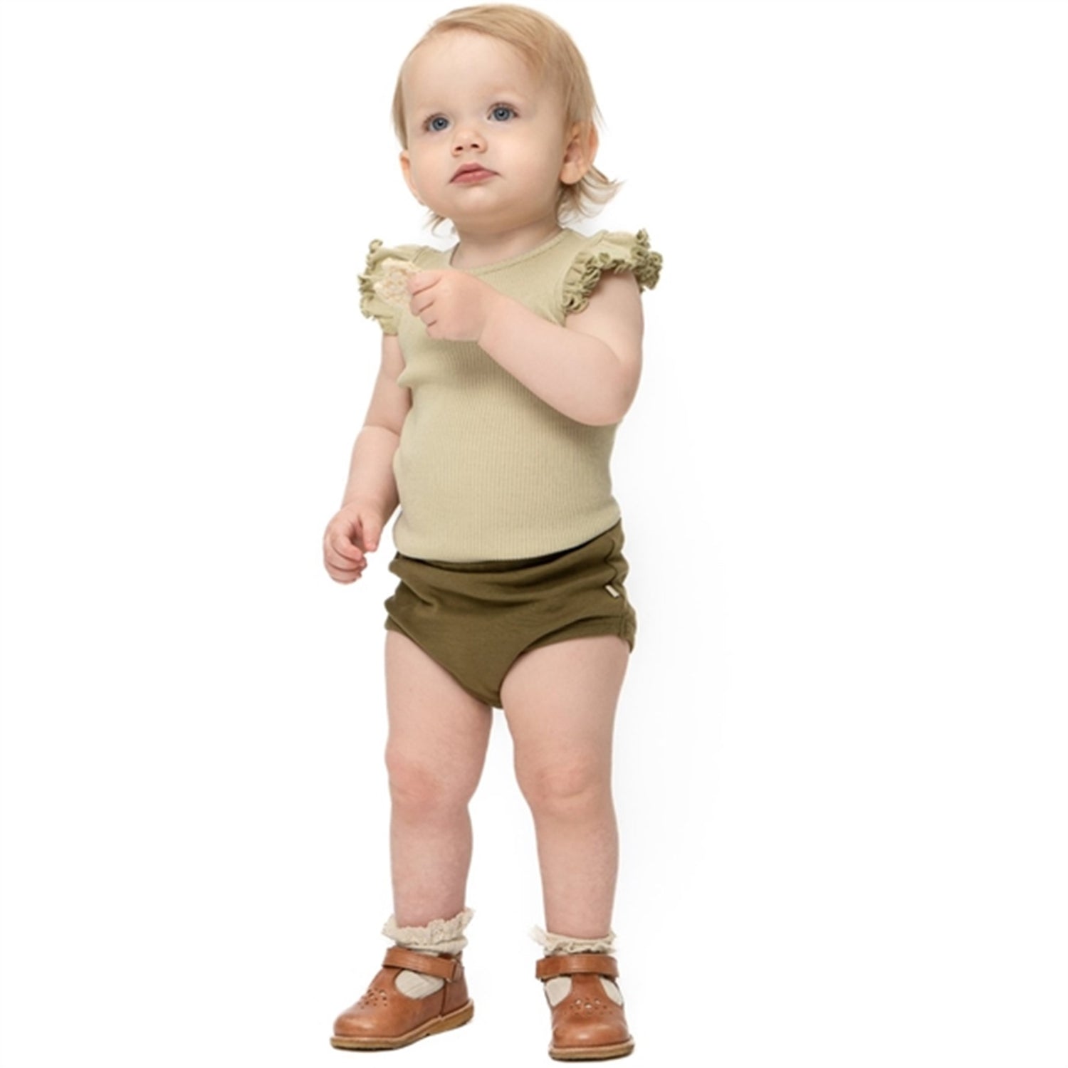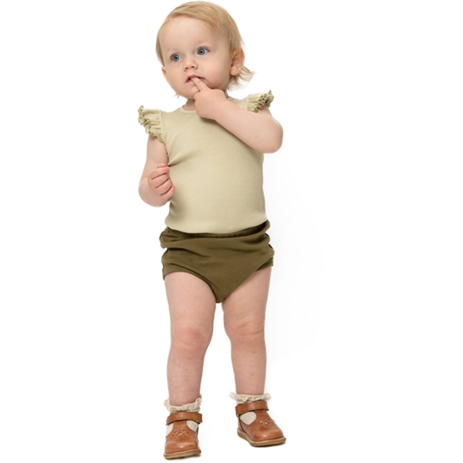Beautiful seamless tank-body in silk-cotton mix with nickel-free YKK snap buttons. The tank-body has a normal leg-opening and frills at the shoulder for a girly look and added sun protection for sensitive shoulders. A single mother-of-pearl button in the back of the neck for easy dressing. A body-hugging fit with great stretchability.