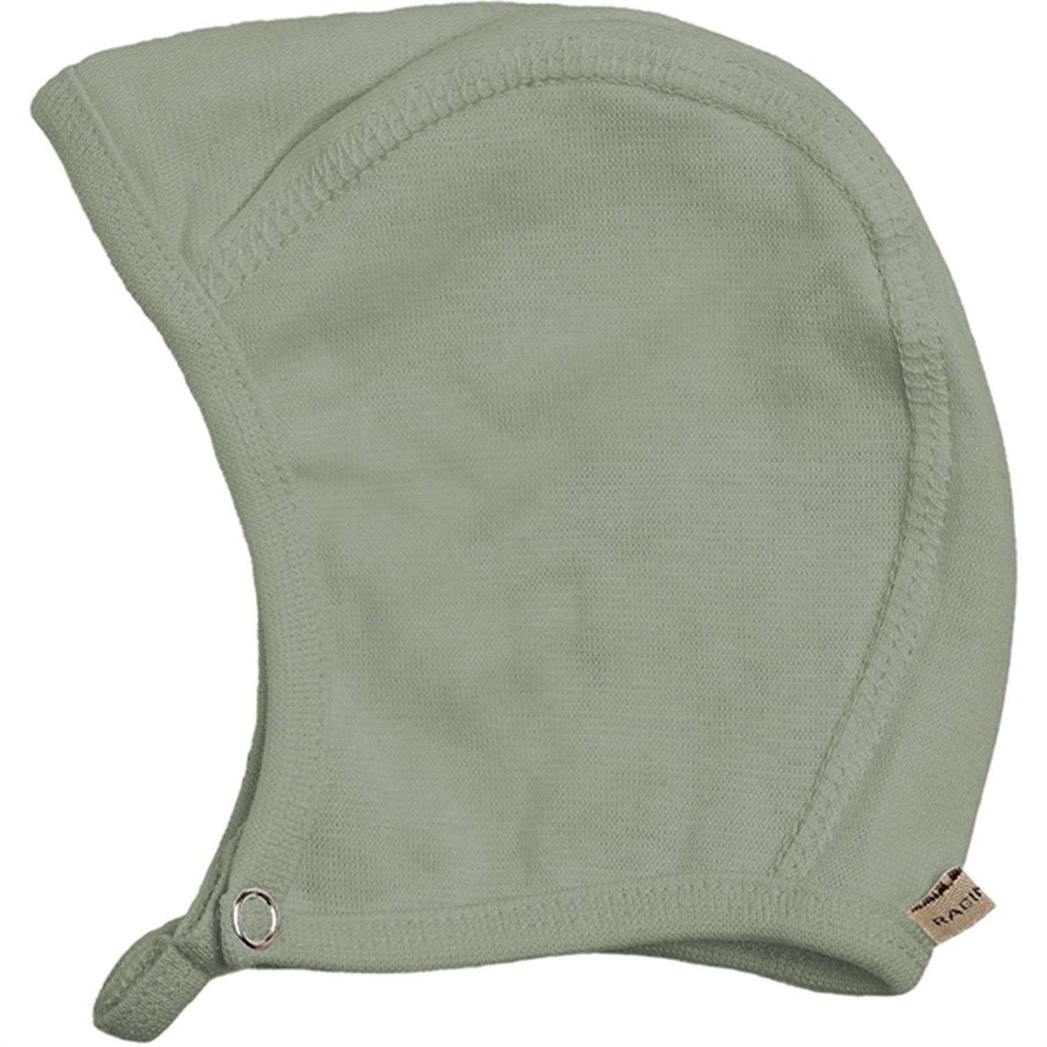 The hat fastens under the chin with an adjustable snap button.