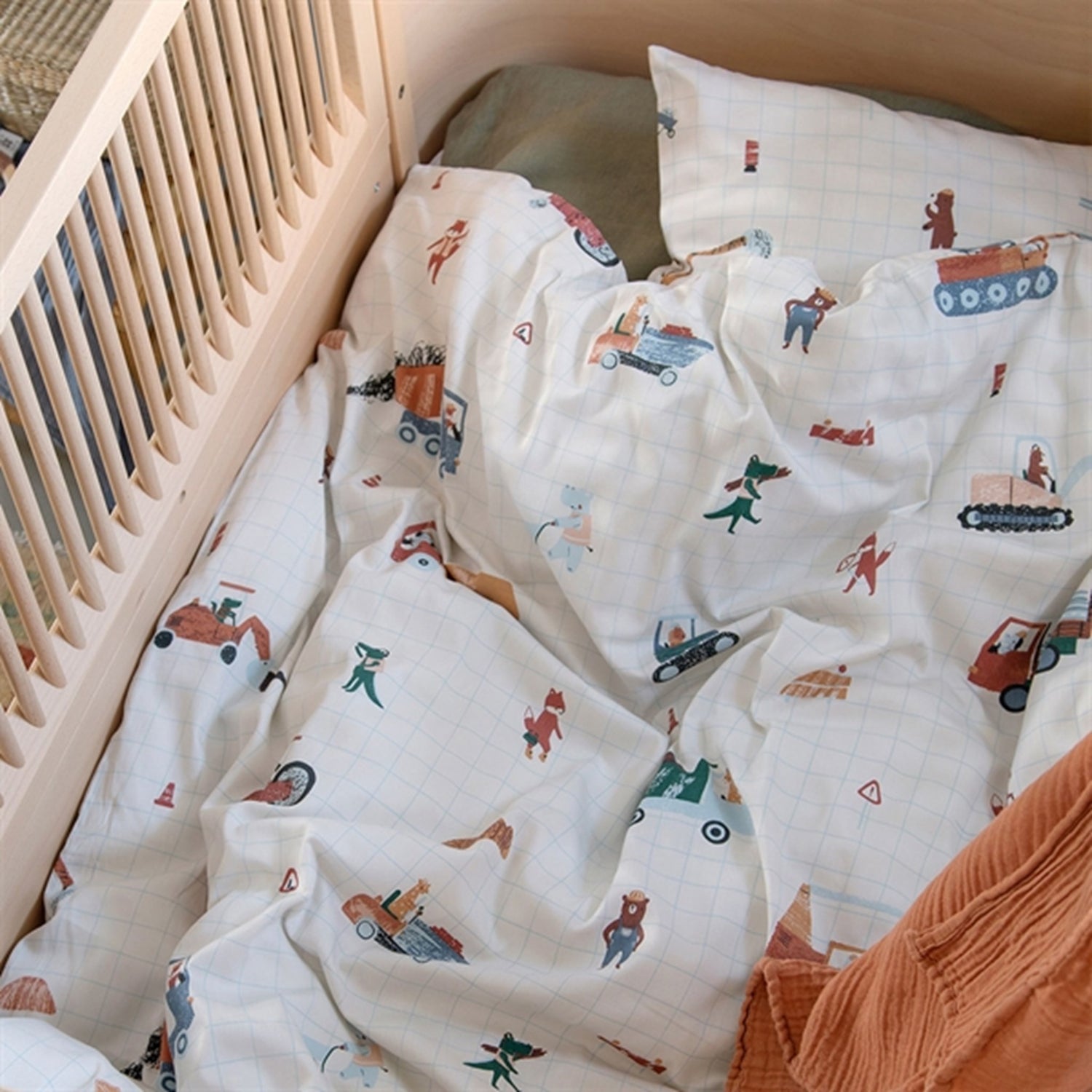 The bed linen is perfect for creating a cosy bedtime ritual where you tell stories about the funny animals from the Busy Builders theme. The satin weave gives the bed linen a smooth, shiny and exclusive surface and, as an extra detail, a textured sensory flap is sewn on to help your child settle down. The duvet and pillowcase have a great YKK zip, which is hidden so it doesn't interfere with sleep. The bed linen comes in a small bag in the same quality and print as the bed linen. The bag can be used for taking toys on the go or for storing a packed lunch and water bottle on a trip.Sebra bed linen has been designed in Denmark and is made in standard Danish sizes, in organic cotton that can be washed at 60℃. The high quality can withstand many washes and be passed down to future siblings.