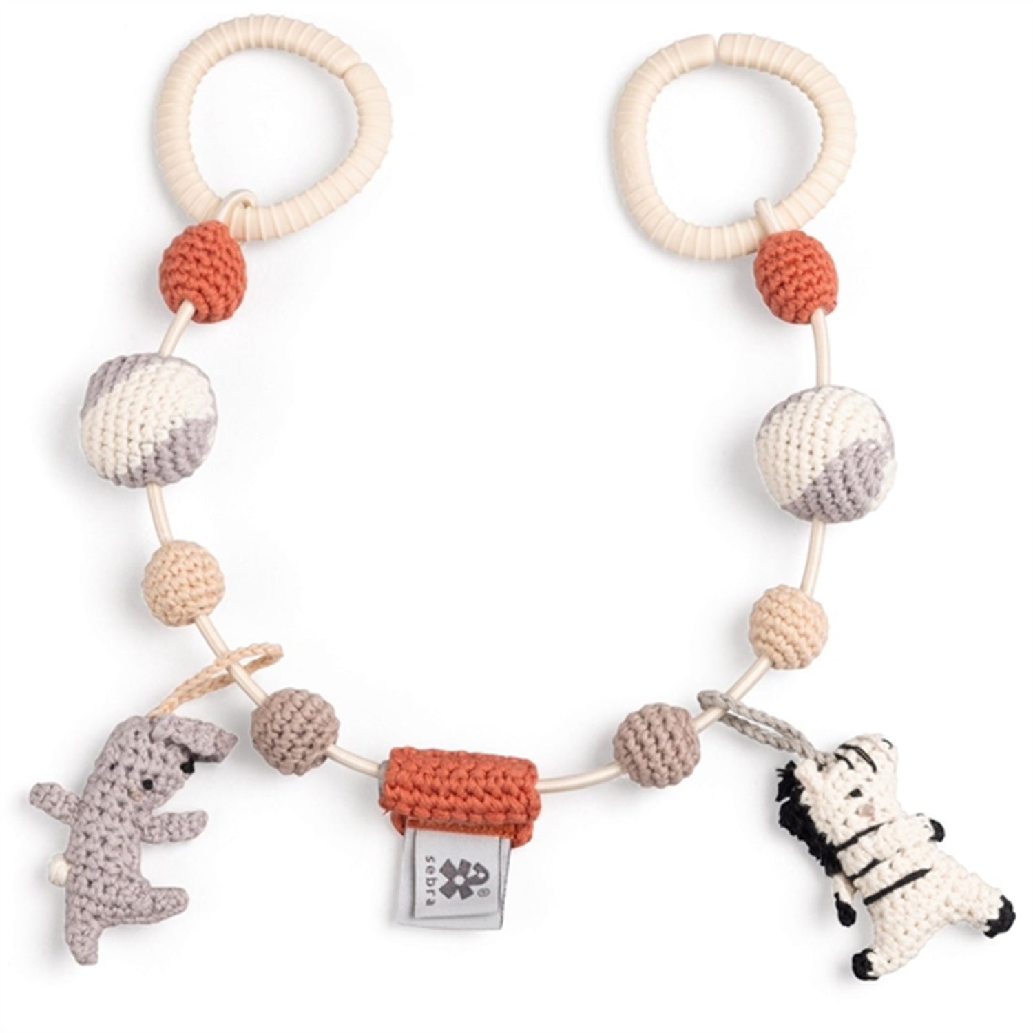 The 48 cm long pram chain attaches to each side of the pram with the handy C-rings and works in the same way as a mobile, capturing the interest of little ones and calming them. The chain is elasticated, so can be extended if your pram is slightly wider.