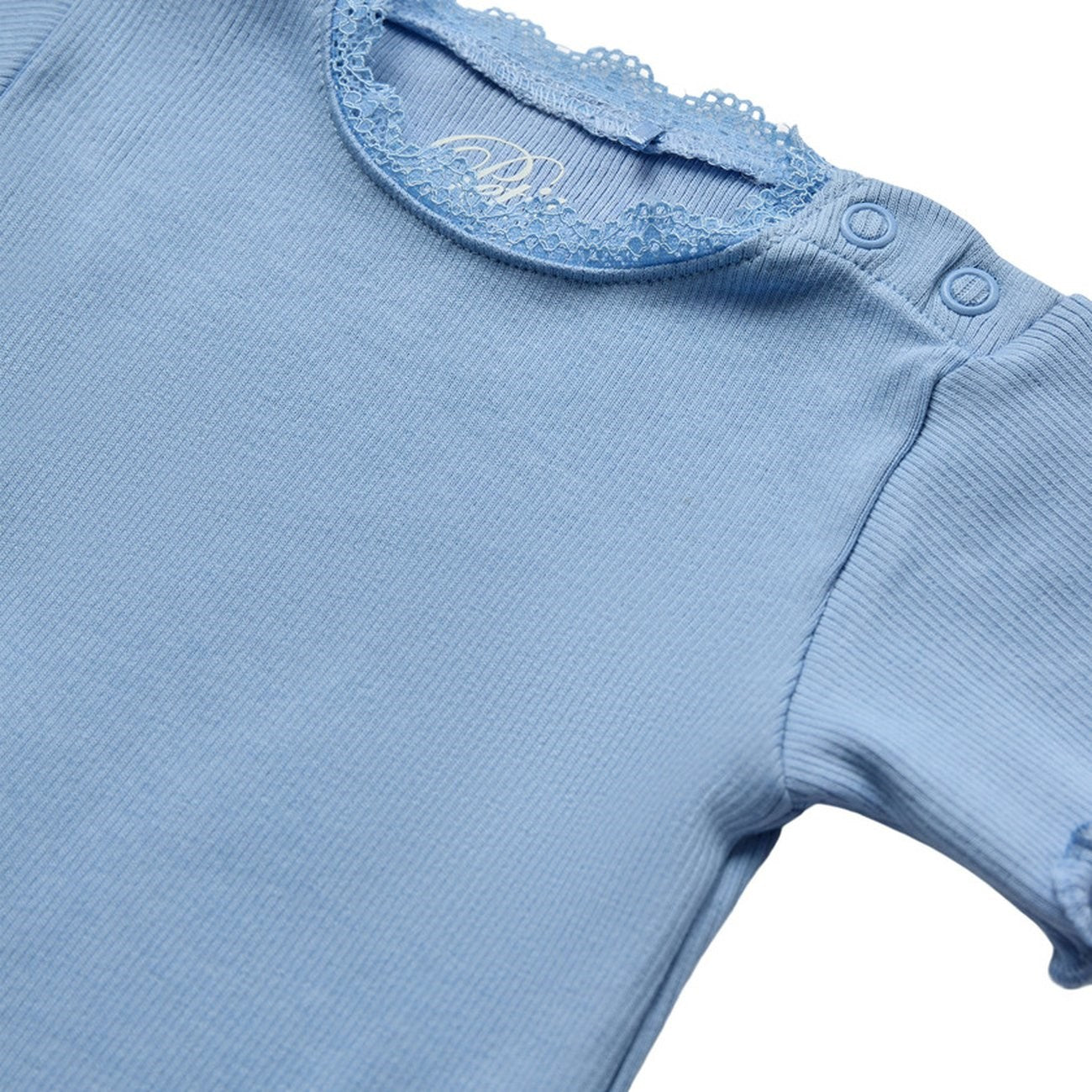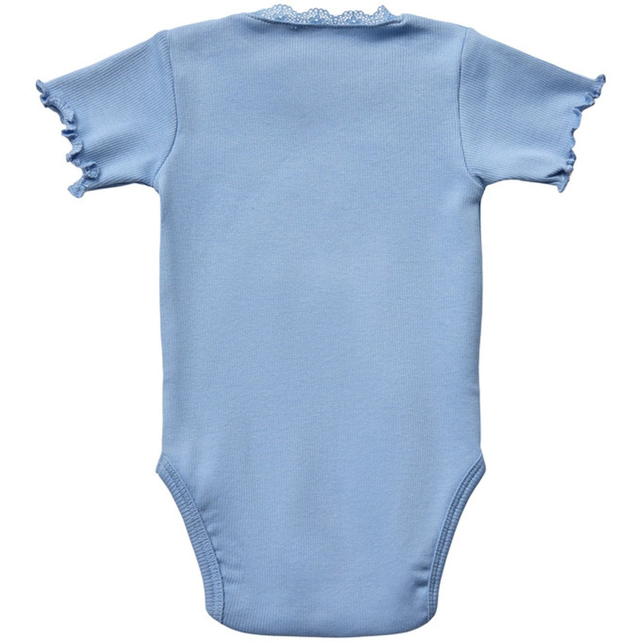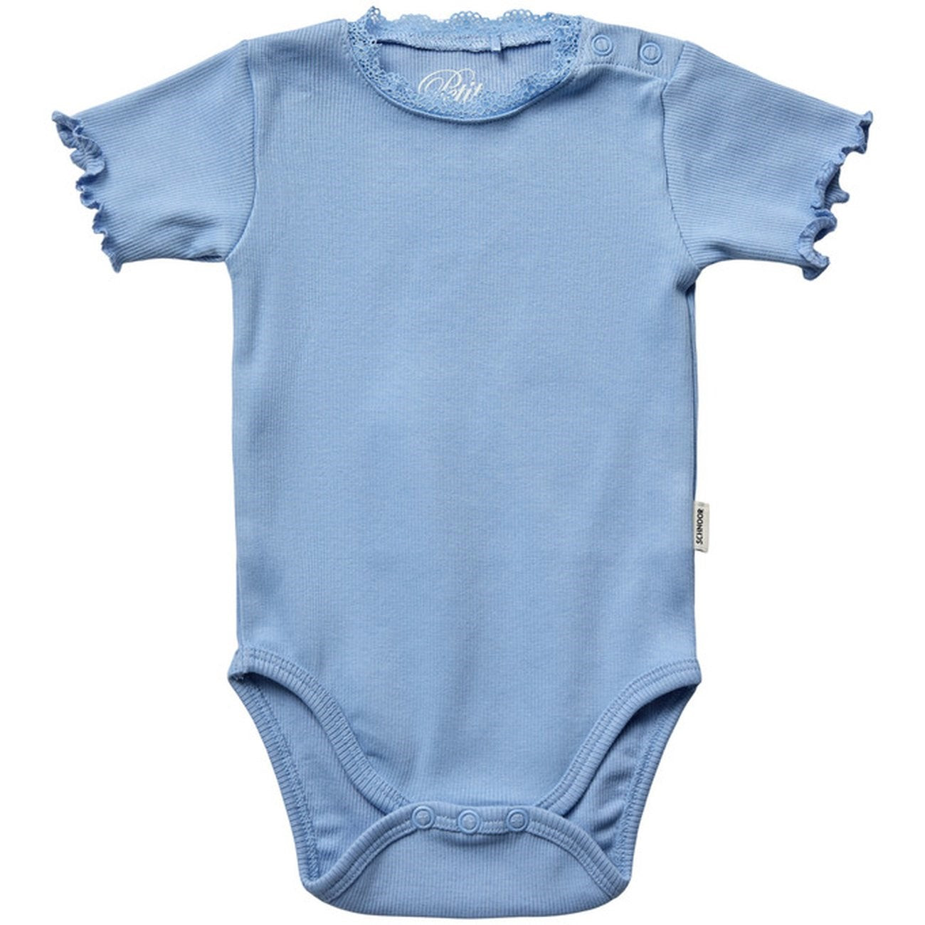 Bright Blue Bodystocking. Jump into a world of comfort and style with Sofie Schnoor's Bright Blue bodystocking! The light ribbed knit and beautiful lace trim at the neck give a nice touch, while the short sleeves and practical button closure at the bottom make it easy to change diapers. Made from 95% soft cotton and 5% elastane, this bodystocking is both soft and stretchable for optimal comfort. Perfect for play and coziness, this bodystocking is a must-have in any small fashionista wardrobe. Remember to follow the washing and instruction manual to keep it beautiful and delicious!