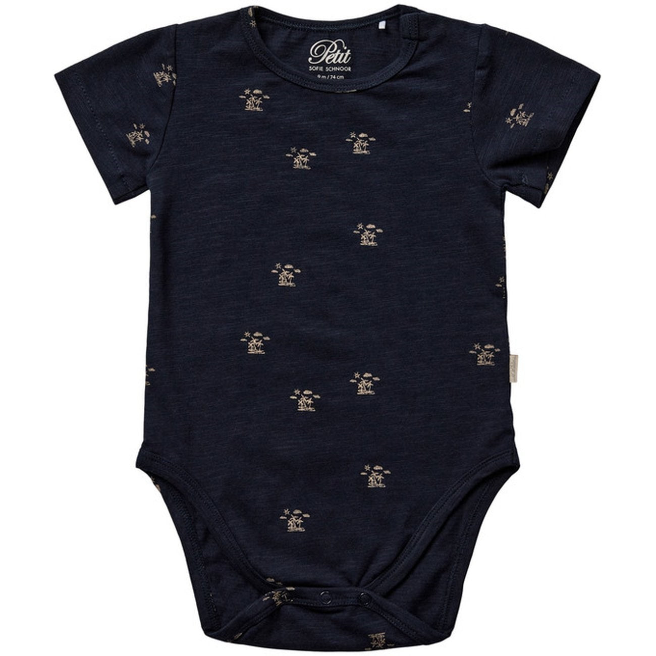 Bodystocking in dark blue with fun animal paw print. It has short sleeves and convenient button closure at the bottom. Designed in soft and stretchable material made of 95% organic cotton. Super cute and comfortable for the little adventurers. 95% cotton, 5% elastane. Remember to follow the washing and instructions for use to preserve the fine print.