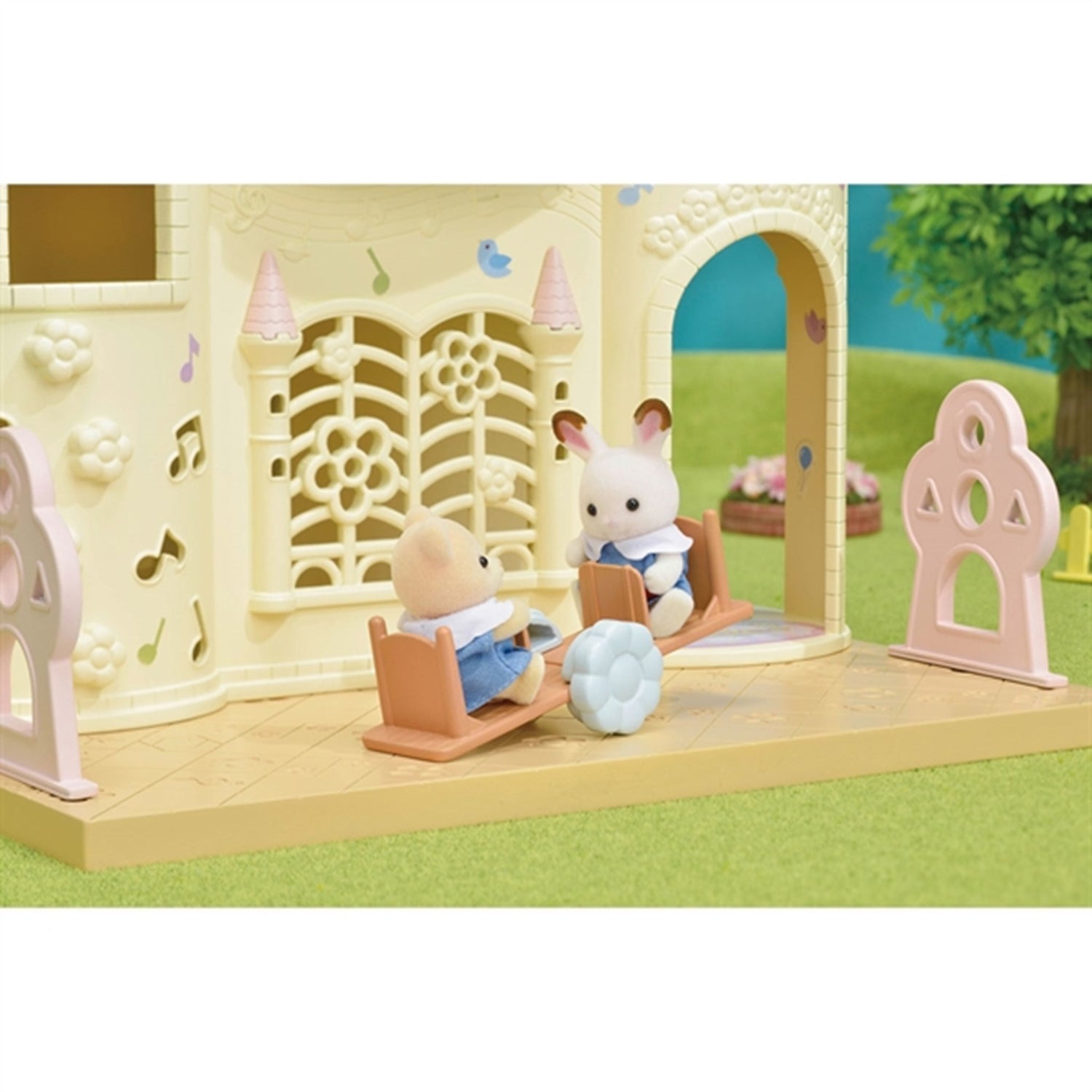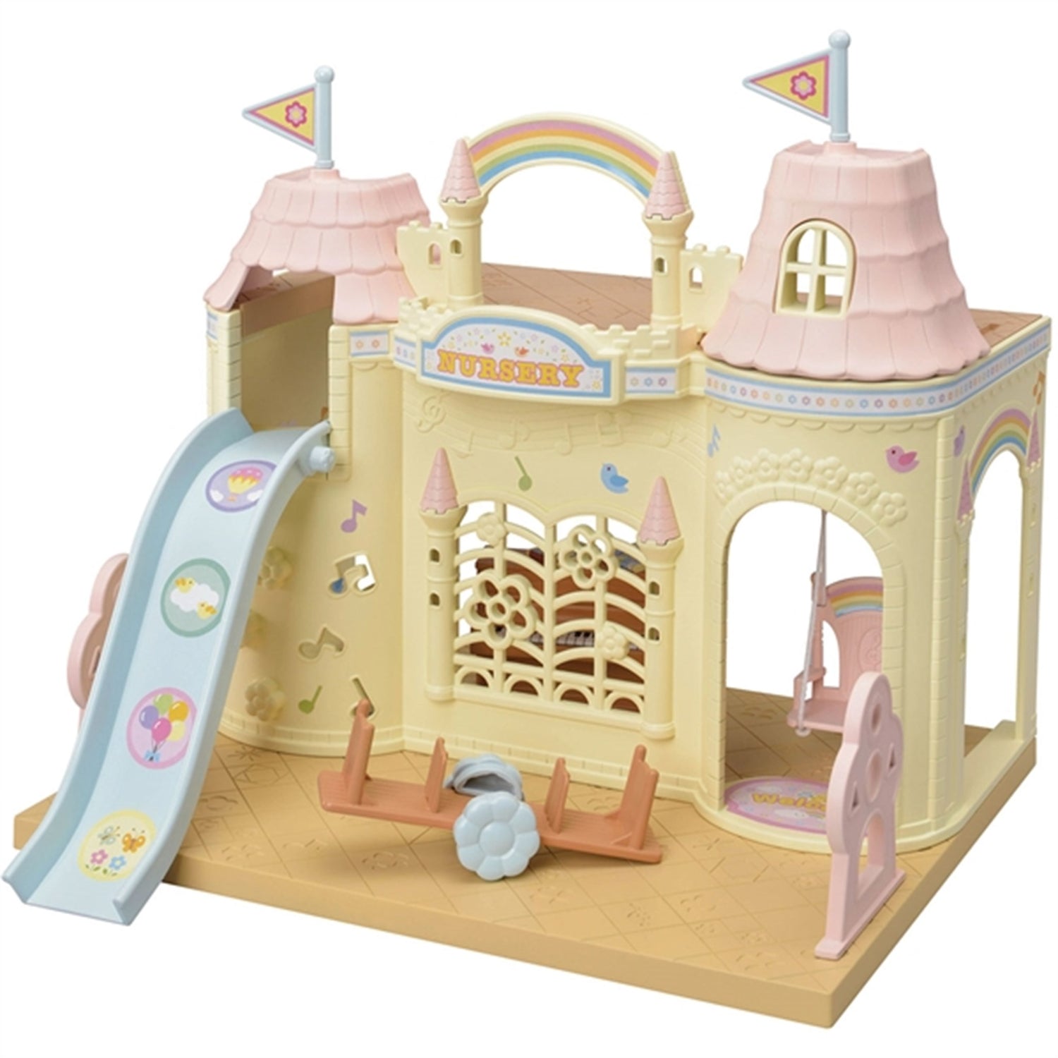 - Includes: Castle Kindergarten, slide, swing, piano, seesaw, table with stools