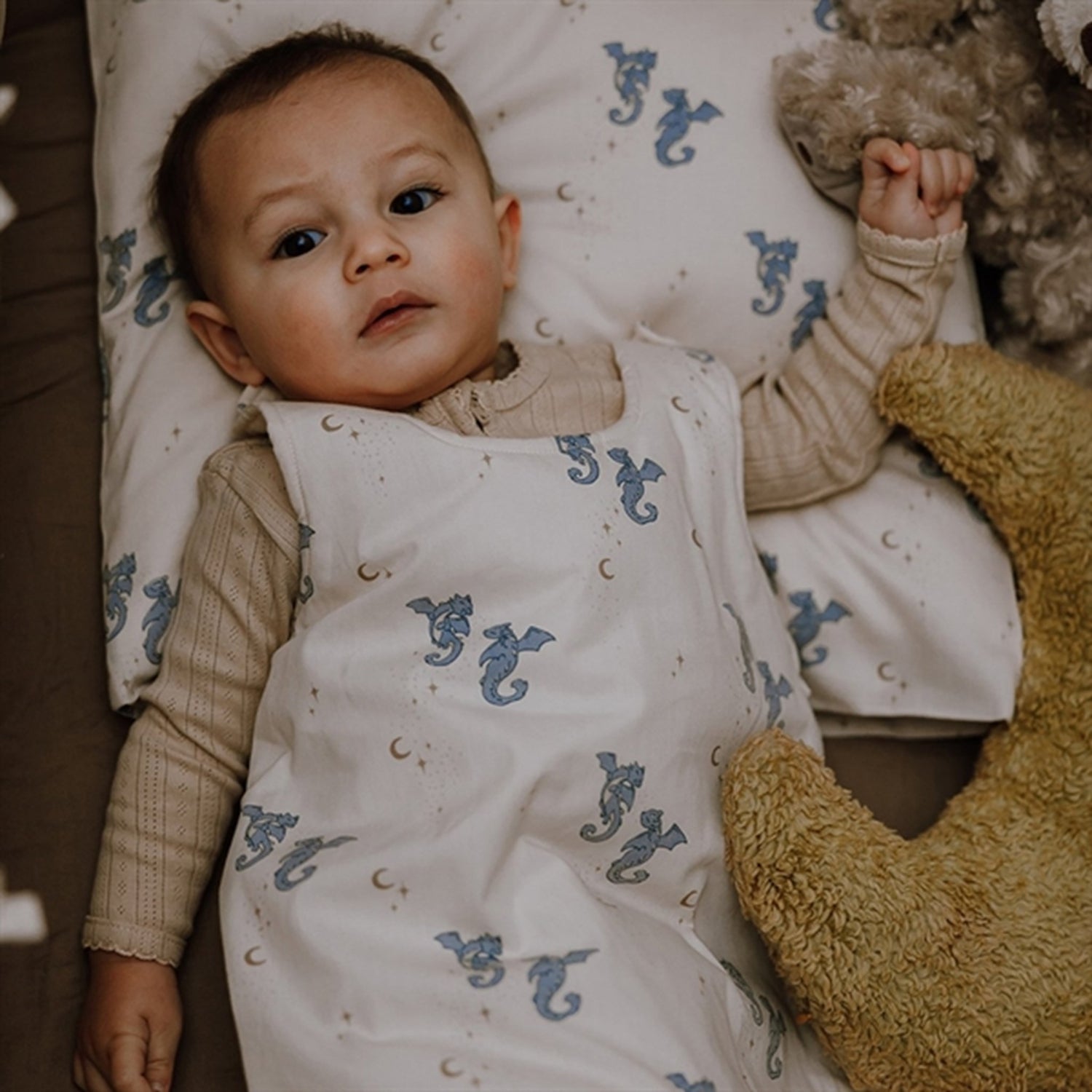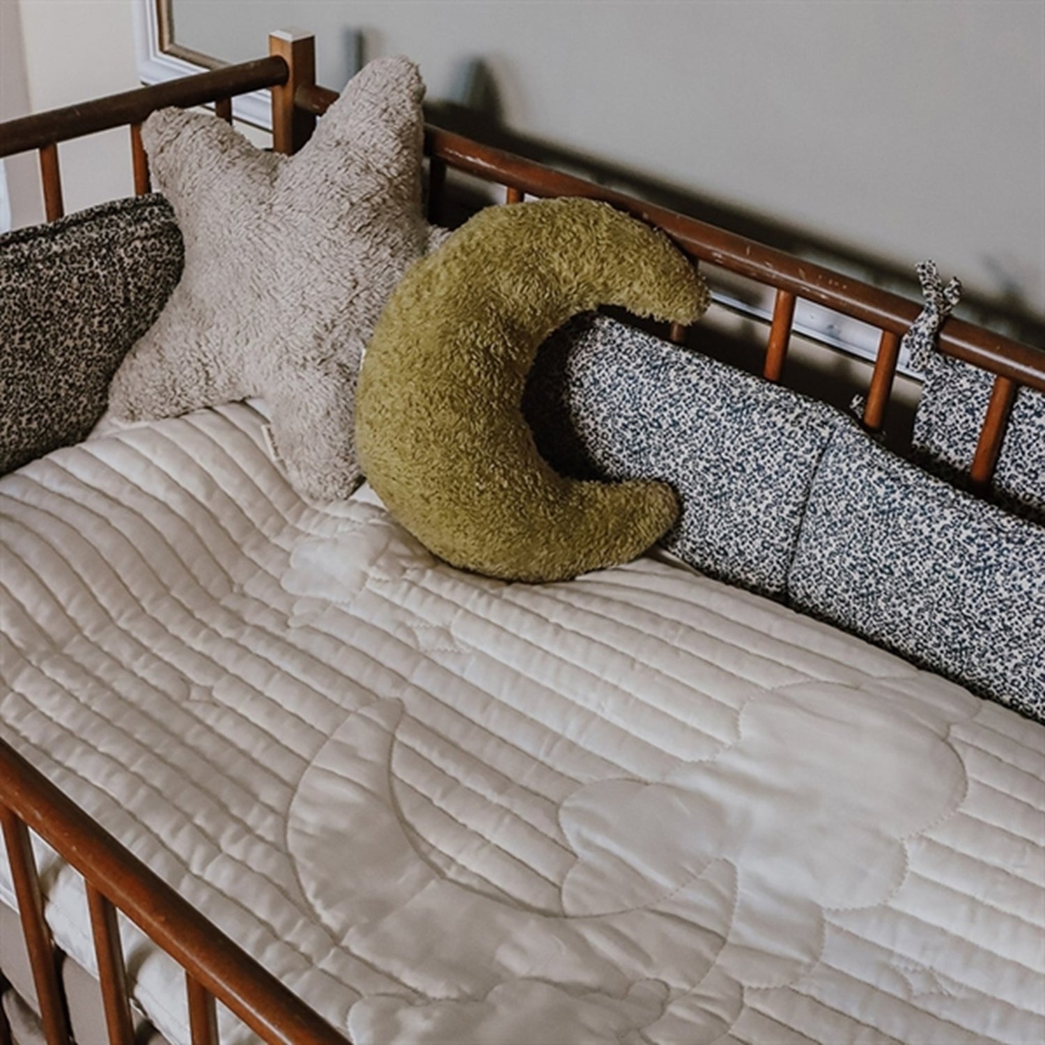 Two cute little decorative pillows for the bed. One pillow has the shape of a star, while the other has the shape of a moon. The pillows are made of soft organic cotton, perfect for snuggling with. The pillows have a zipper so that the cover can be easily removed and washed.