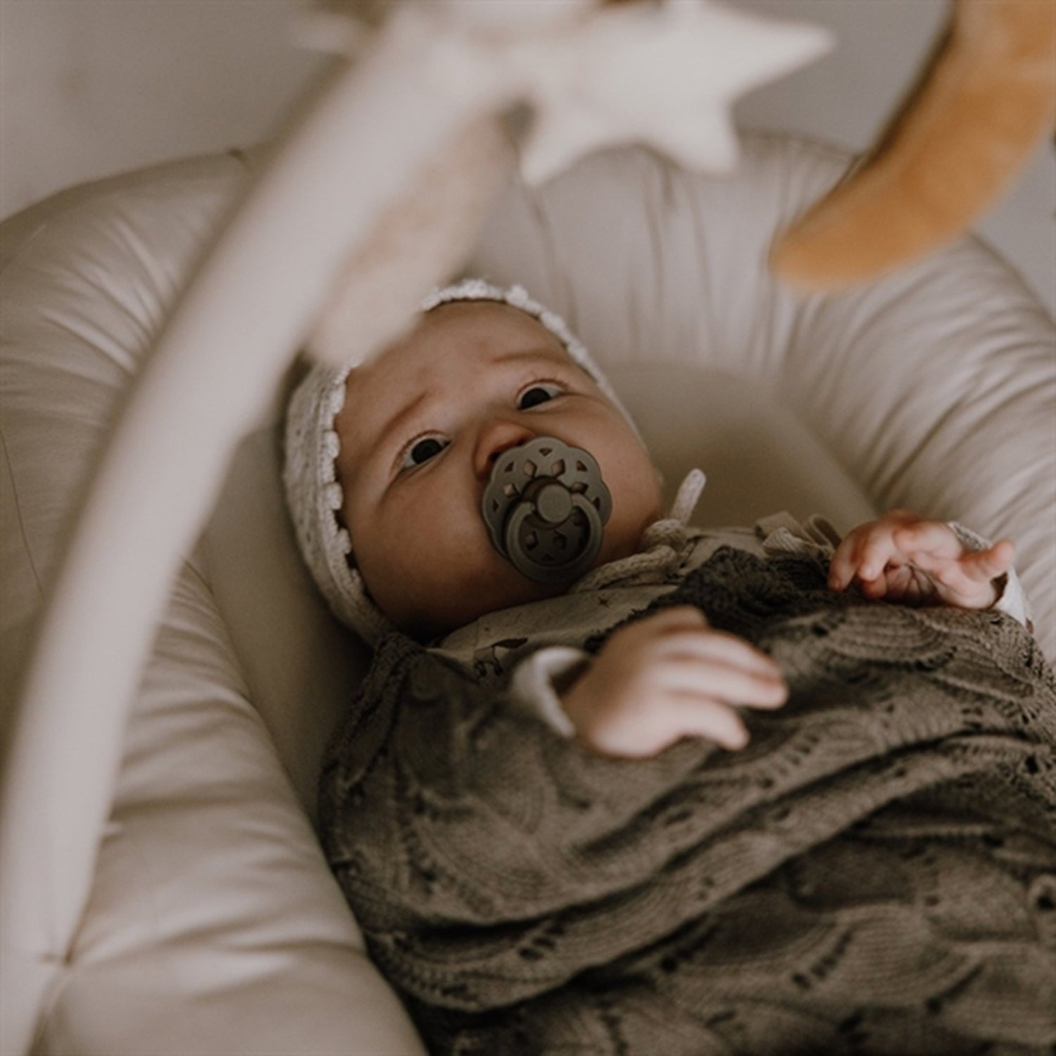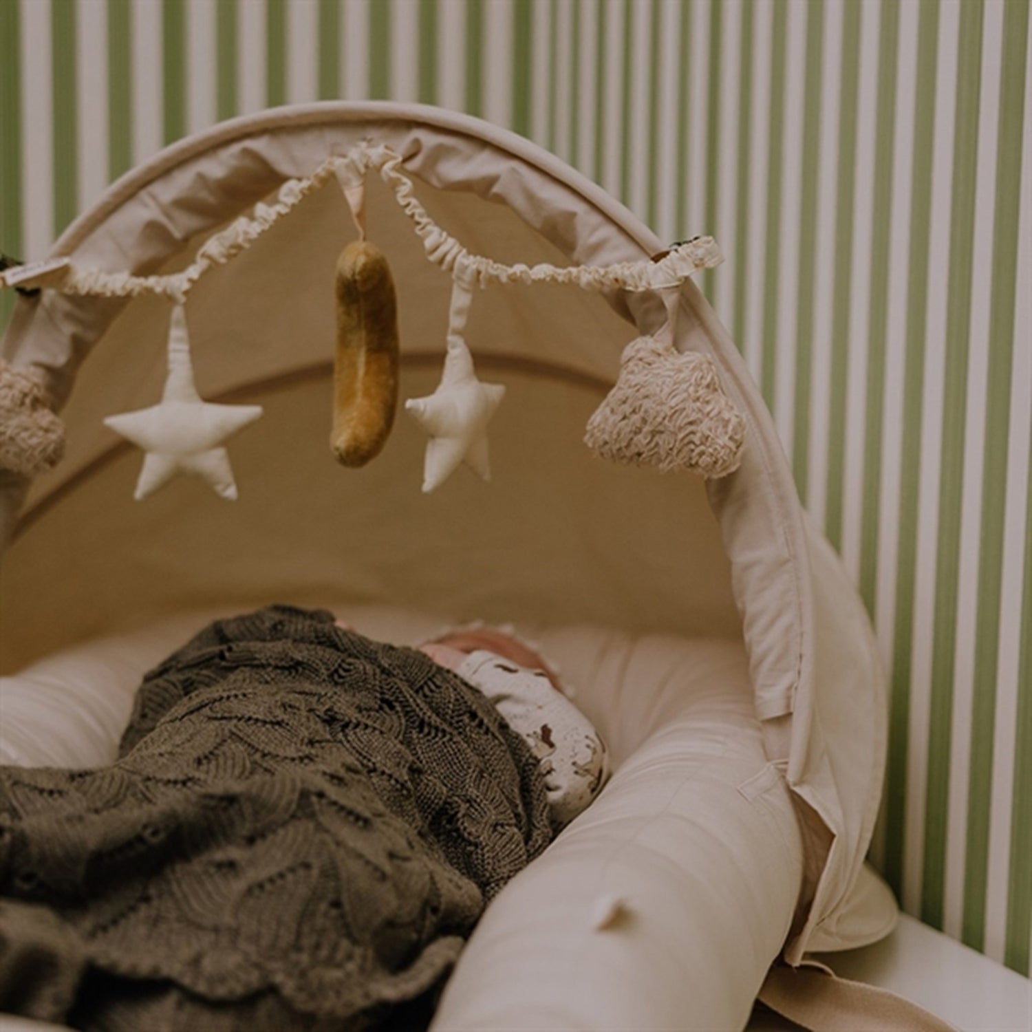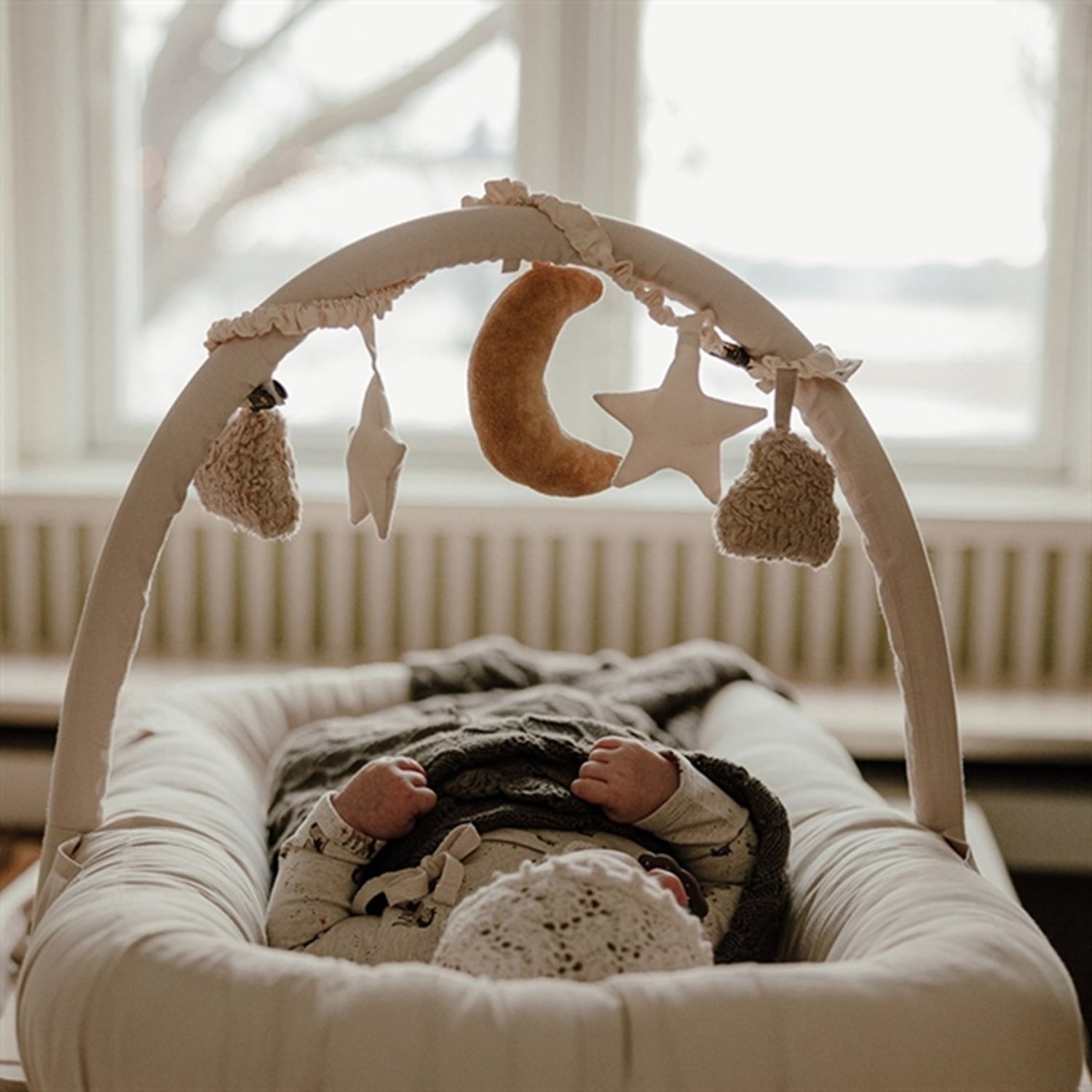 The Stroller chain has two stars, two clouds and on big moon as a pendantThe Stroller chain is super cute and perfect for the baby to look at and play with. The Stroller chain is made in an elastic band so you can have perfect length for the pram. The Stroller chain is cliped on in each end. The clips are in metalic.The chain must be washed by hand.