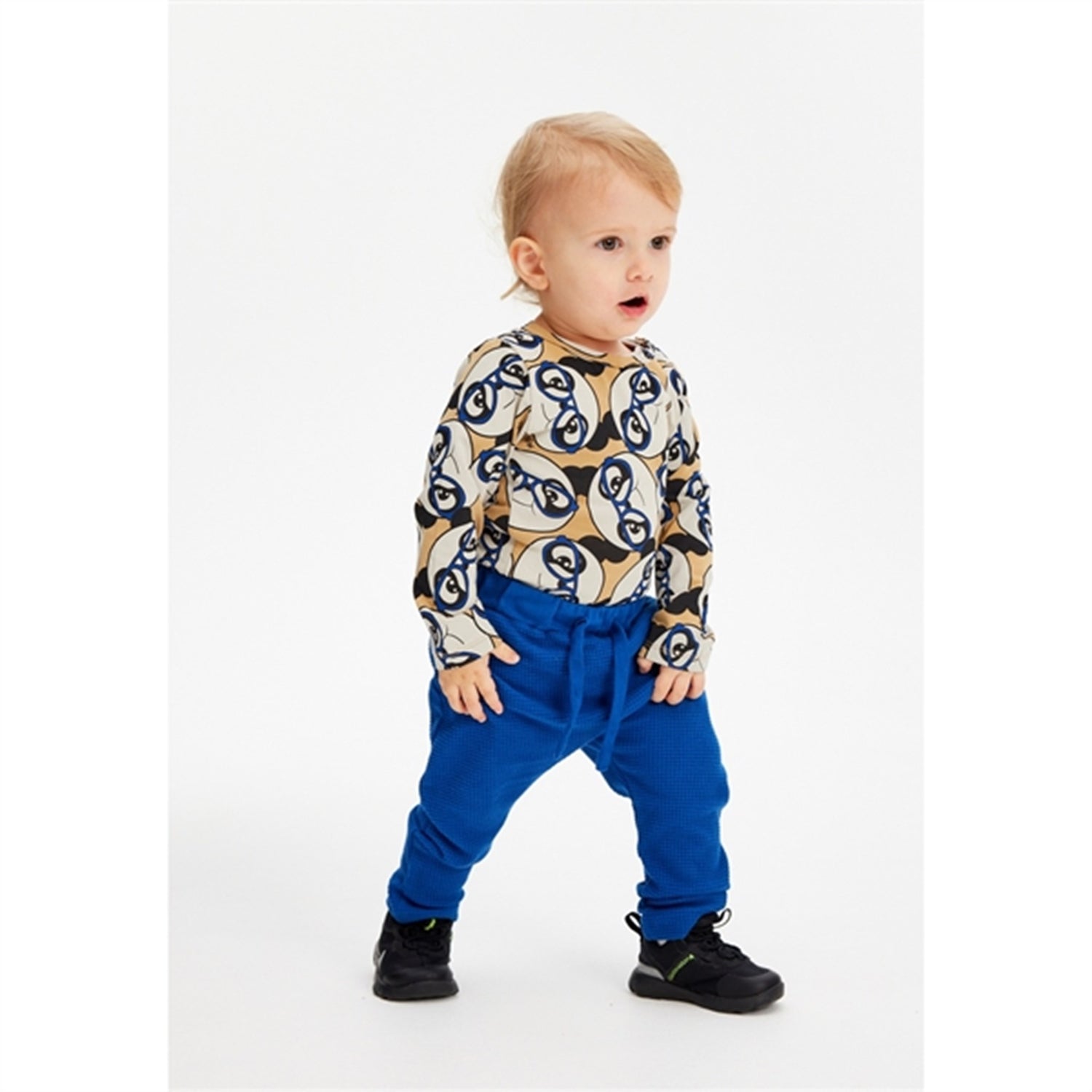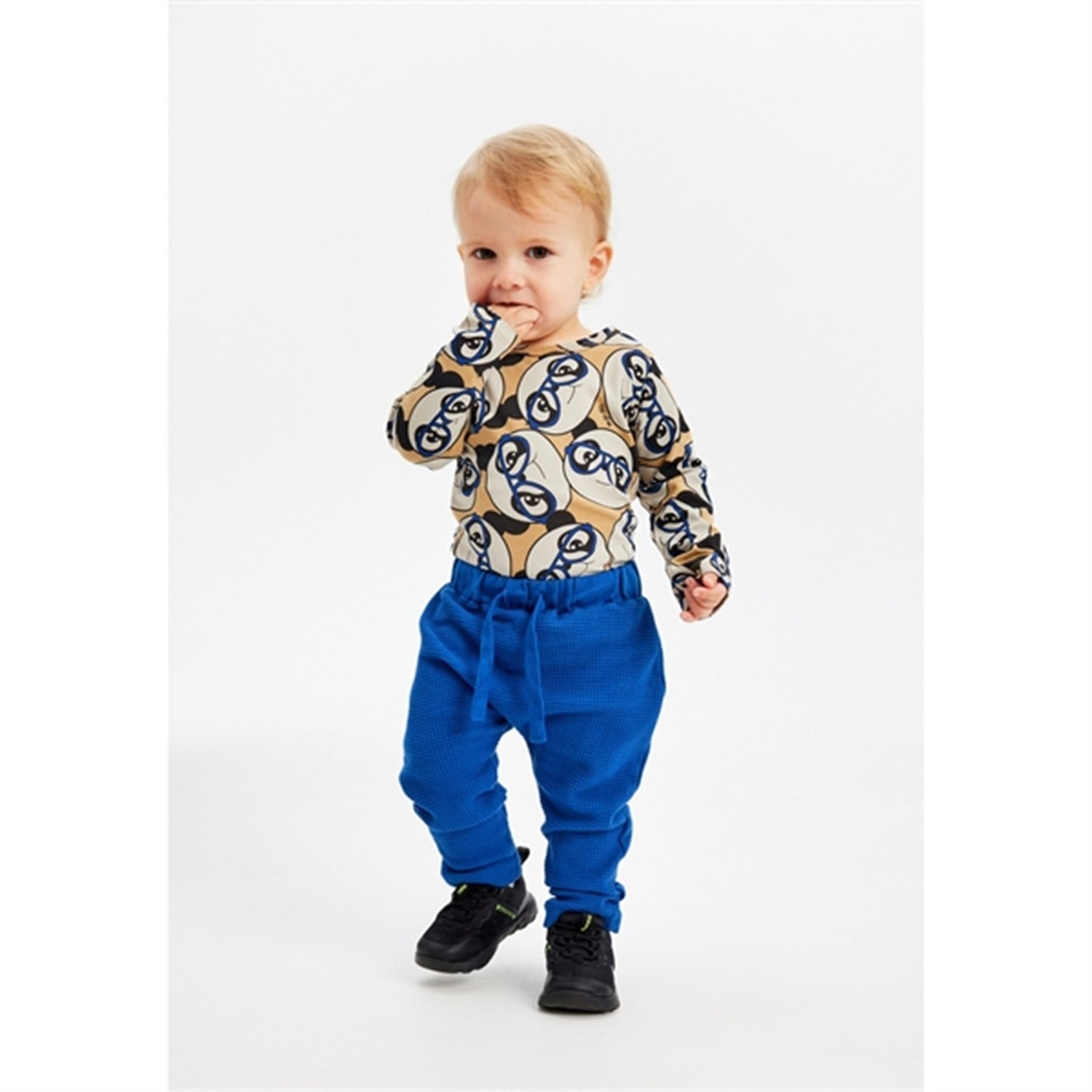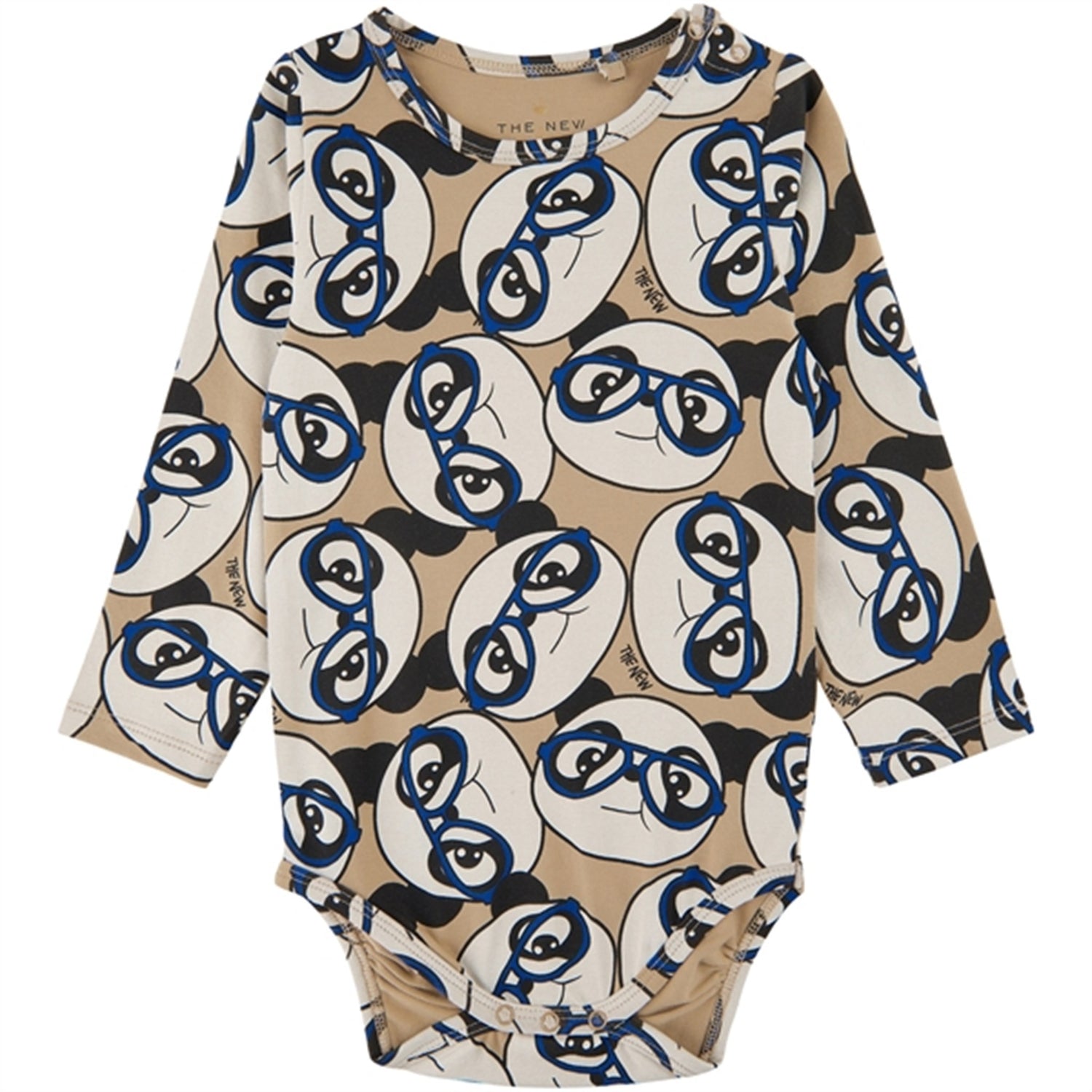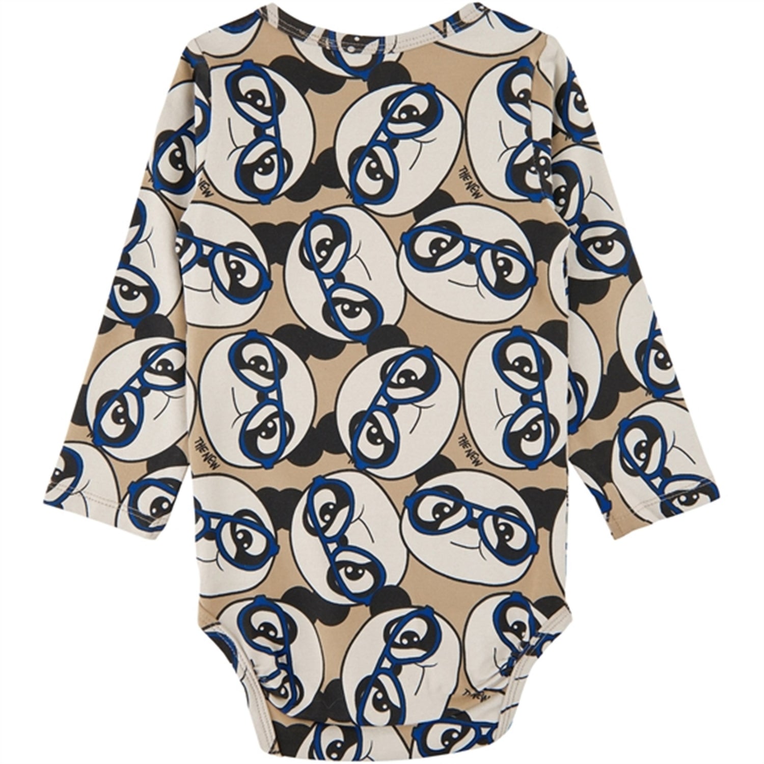 Fun and eye-catching long-sleeved baby bodysuit with a cute illustrated pattern of a playful and adorable panda wearing blue glasses. This bodysuit from THE NEW siblings is made of organic cotton to avoid harmful chemicals and make it soft, lightweight, and breathable. We have also added 5% stretch to ensure free movement and comfort for your child to play and explore. Whether your child is crawling, playing, or dancing, this bodysuit is a great companion for new adventures. Pair it with the matching panda pants or leggings for a sweet coordinated set.- Regular fit with long sleeves and round neckline.- Patterned all-over print (AOP) design.- Convenient snap closure at the crotch and on one shoulder.- Jersey quality made of 95% organic cotton and 5% elastane.- GOTS certified, which guarantees that it is made with certified organic materials, under strict requirements for social and environmental practices, and without harmful chemicals.